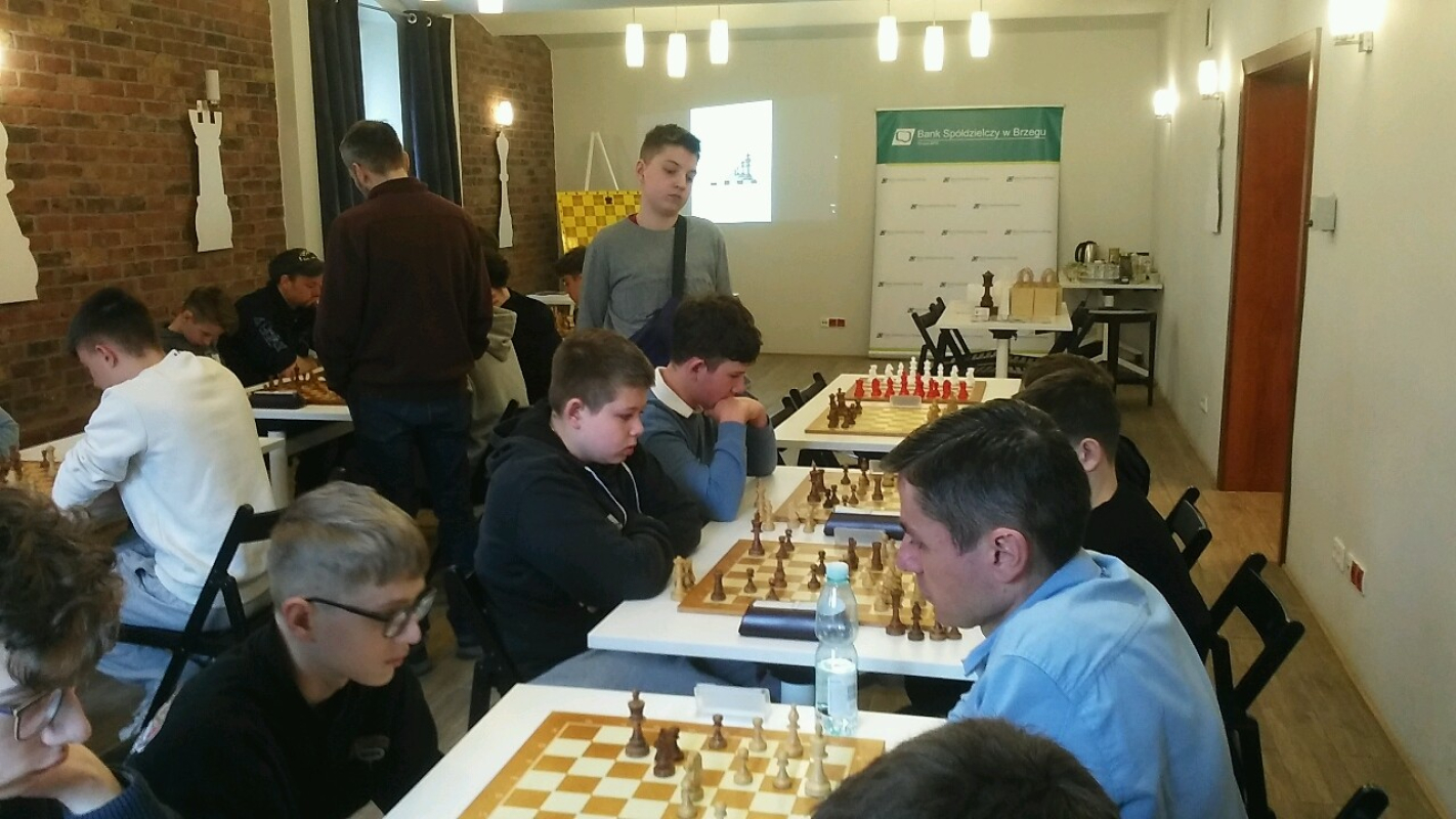 Michał Czerwiński (MGLKS Parnas Oława) w drugiej rundzie wyprzedził naszego lidera Antoniego Sokołowskiego o 2 sekundy i trzeba powiedzieć jasno, że ten wynik ustawił dalszą część rywalizacji. Po pięciu rundach granych w tempie P10 w czołówce byli : 1. Michał Czerwiński (4,5), 2. Antoni Sokołowski (4), 3. Mateusz Nowak (4), Bartosz Polniak (3,5) i 5. Jakub Pawłowski (3,5). W części "pięciominutówek" doszli do głosu zawodnicy z lepszym refleksem i uważniejsi w grze. Pierwsze dwie lokaty nie uległy zmianie. Jakub Drozd z Dobrzynia (IILO) awansował na podium po ataku z siódmego miejsca. Zagrano 100 partii tak jak zaplanowano. Bardzo dziękujemy Prezesowi Banku Spółdzielczego w Brzegu, Leokadii Wilkowskiej, Wiceprezes, Bożenie Wdowiszewskiej i Panu Marcinowi Preisowi za ogromną życzliwość i przydzielenie środków finansowych na zakup medali i nagród dla uczestników turnieju. Wdzięczni jesteśmy również gospodarzom wydarzenia, Dyrektor, Katarzynie Oćwiei - Grądziel, oraz pracownikom, Paniom Ewie i Oli za wspaniałe jak zwykle przyjęcie i opiekę.