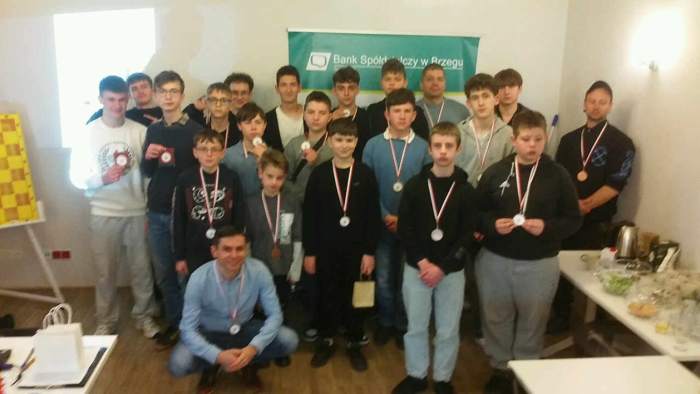 Michał Czerwiński (MGLKS Parnas Oława) w drugiej rundzie wyprzedził naszego lidera Antoniego Sokołowskiego o 2 sekundy i trzeba powiedzieć jasno, że ten wynik ustawił dalszą część rywalizacji. Po pięciu rundach granych w tempie P10 w czołówce byli : 1. Michał Czerwiński (4,5), 2. Antoni Sokołowski (4), 3. Mateusz Nowak (4), Bartosz Polniak (3,5) i 5. Jakub Pawłowski (3,5). W części "pięciominutówek" doszli do głosu zawodnicy z lepszym refleksem i uważniejsi w grze. Pierwsze dwie lokaty nie uległy zmianie. Jakub Drozd z Dobrzynia (IILO) awansował na podium po ataku z siódmego miejsca. Zagrano 100 partii tak jak zaplanowano. Bardzo dziękujemy Prezesowi Banku Spółdzielczego w Brzegu, Leokadii Wilkowskiej, Wiceprezes, Bożenie Wdowiszewskiej i Panu Marcinowi Preisowi za ogromną życzliwość i przydzielenie środków finansowych na zakup medali i nagród dla uczestników turnieju. Wdzięczni jesteśmy również gospodarzom wydarzenia, Dyrektor, Katarzynie Oćwiei - Grądziel, oraz pracownikom, Paniom Ewie i Oli za wspaniałe jak zwykle przyjęcie i opiekę.