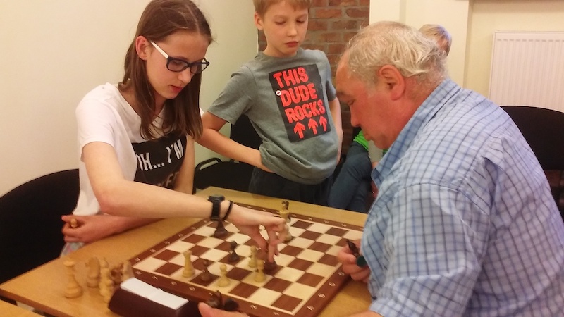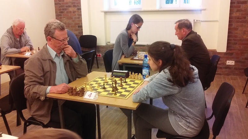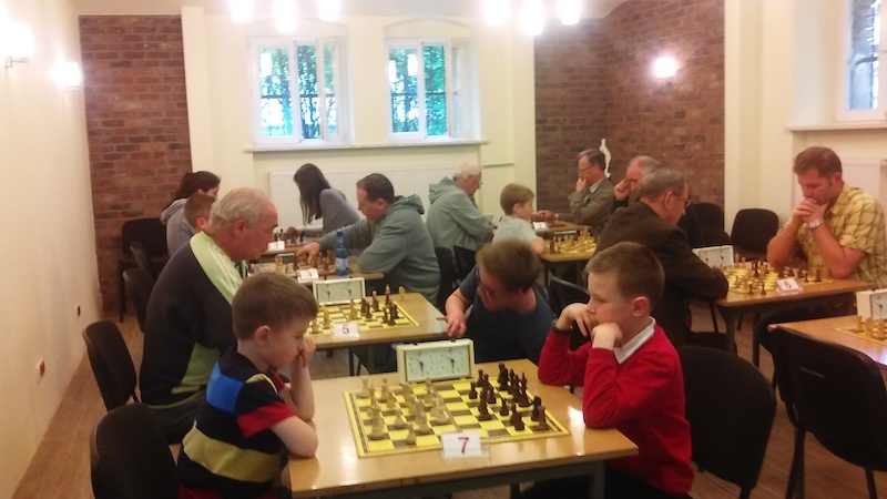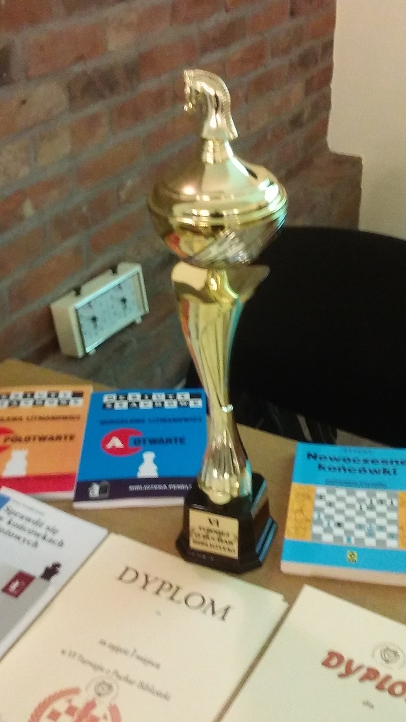 Pierwszego dnia rozegrano turniej o Puchar Biblioteki, który wygrała z dorobkiem sześciu punktów Wiktoria Sowa, mimo iż nie mogła zagrać od pierwszej rundy. Najwięcej kłopotów zawodniczce UKS Rodło Opole sprawił Michał Maciejowski (zdjęcie nr 3), który być może, gdyby w końcówce hetmańskiej zdecydował się ustawić "wiecznego szacha", to uratowałby cenny remis. Przegrał na czas. Pan Michał zdobył "połówkę" rundę wcześniej w dramatycznej partii z Piotrkiem Kogutem. Po dotknięciu wieży, atakowanej przez hetmana, musiał go za nią oddać, bo wieży pilnował hetman. Doszło do pojedynku hetmana Piotrka z gońcem pana Michała. Piotrek wykorzystał limit czasu, panu Michałowi zostało na zegarze sześć sekund. Remis. Drugie miejsce w rywalizacji turniejowej przypadło weteranowi Janowi Wawrzyniakowi, który lepszą punktacją pomocniczą wyprzedził trzecią w tabeli Magdalenę Jurkowską. Dokładne wyniki znajdziesz na stronie chessarbiter.com